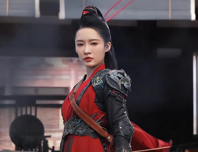 她饰演的付一笑是名武将,红衣铠甲,头发扎成高马尾,站在城楼之上,睥睨敌人的眼神流露着高傲自信,英姿飒爽。