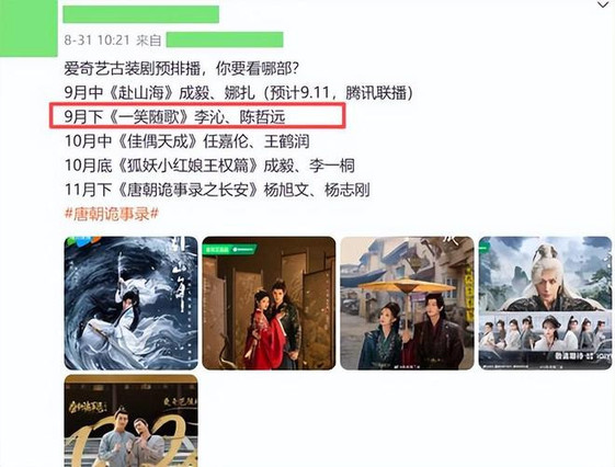 网传桃厂的预排播名单中,《一笑随歌》将在9月下旬播出。
