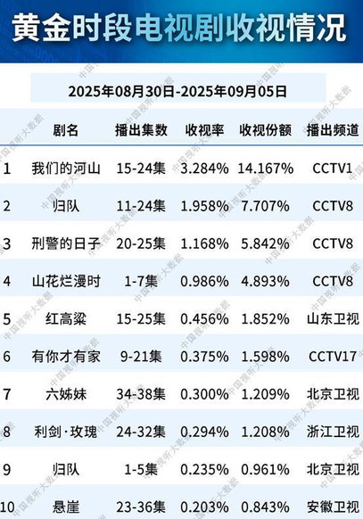 反倒是上星剧之间的竞争热火朝天,眼下总局发布了2025年8月30日到9月5日黄金时段的电视剧收视情况。