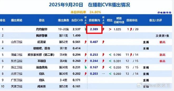 此前《生万物》以精彩的剧情一路领跑,成了央八三年收视之冠,本以为稳坐2025央八年冠之位,结果《灼灼韶华》霸气逆袭,首播峰值破2.8%,直接拿下全国收视第一。截至目前,《灼灼韶华》集均CVB达2.427%,超越《生万物》的2.388%,暂列央八2025年收视年冠。