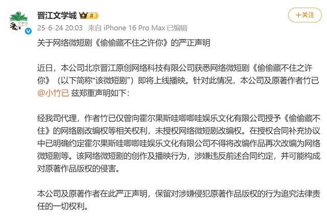 事情起源于网络微短剧《偷偷藏不住之许你》近日即将上线播映。晋江文学城所属的北京晋江原创网络科技有限公司(以下简称“晋江”)在得知这一消息后,联合原著作者竹已在6月24日晚间发布了一份声明。