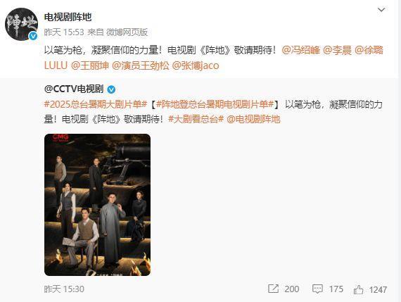 由广西壮族自治区党委宣传部、广西广播电视台、广西电视传媒发展集团有限公司和杭州桂花影业有限公司出品,高希希执导,钱林森编剧,冯绍峰、徐璐、李晨、王丽坤、王劲松、张博、刘劲等主演的电视剧《阵地》,也在片单中!