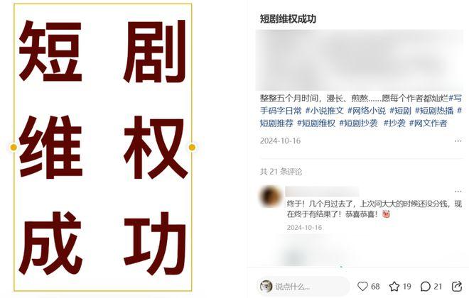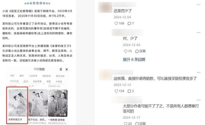 她也表达了复杂心情:“很高兴自己的故事能被拍成短剧并受观众喜爱,但也非常遗憾剧方绕过了版权和我本人。要尽快遏制短剧抄袭网文的现象,关键在于网文平台对版权的严格监管及其维护作者权益的坚定立场。只有平台展现出强硬态度并切实支持维权,作者才更有勇气和底气去抗争。”