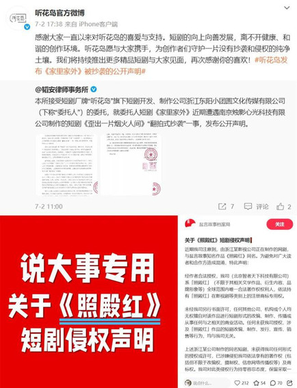 在小红书、微博等社交平台搜索“短剧抄袭”,会发现大量网文作者遭遇侵权,几乎每周都有新的维权信息出现。被控侵权的短剧不仅上线于主流短剧平台,涉事主体甚至包括一些知名短剧制作厂牌。