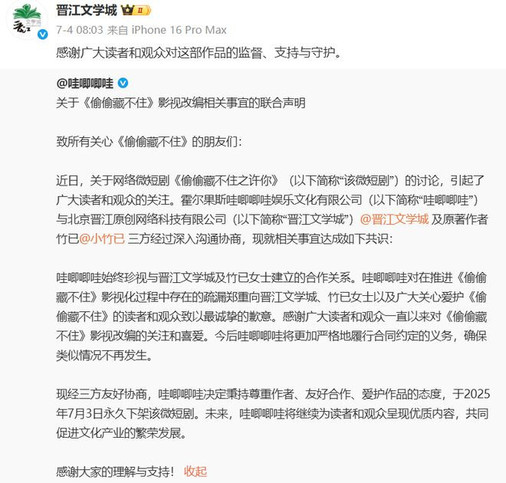 比如,前几日哇唧唧哇与晋江就《偷偷藏不住》改编的短剧《偷偷藏不住之许你》发生版权纠纷。声称持有该IP的所有改编权,晋江则否认曾授权网络微短剧版权。双方在微博用公告大战300个回合后,该短剧最终下架,这场版权争议以晋江坚守版权立场并取得胜利而告终。