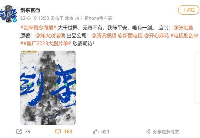 一直到2023年6月官方发布了全新的概念海报,同时宣布剧集由腾讯视频、开心麻花影业、新丽电影联合出品,剧版《剑来》项目才算落定下来。