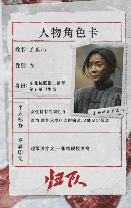 袁姗姗在《归队》中饰演兰花儿。兰花儿是温柔坚韧的小队卫生员,她在剧中靠自己的一张嘴,就能硬控土匪窝,说服土匪老大改邪归正。