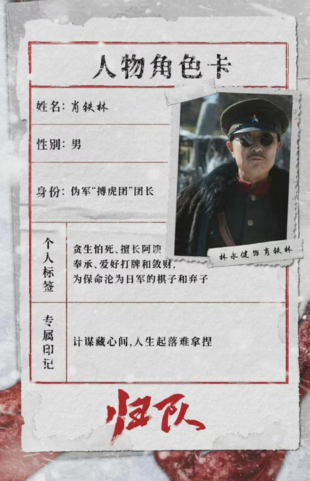 肖铁林是伪军“搏虎团”团长,他贪生怕死,擅长阿谀奉承,爱好打牌和敛财,为保命沦为日军的棋子和弃子。