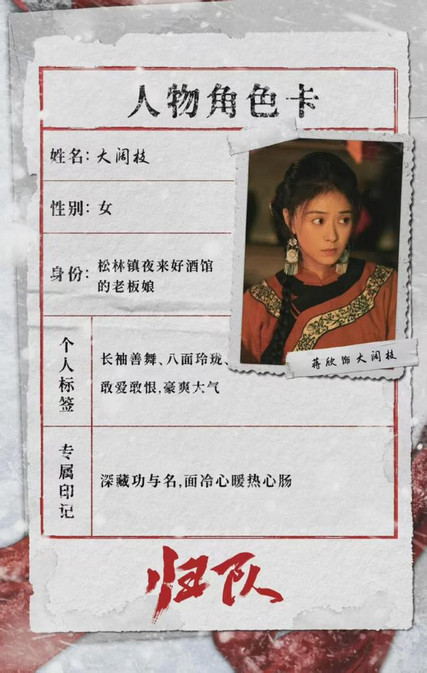 蒋欣在《归队》中饰演大阔枝。大阔枝是民间抗日力量代表,她是松林镇夜来好酒店老板娘。大阔枝长袖善舞八面玲珑,敢爱敢恨豪爽大气。