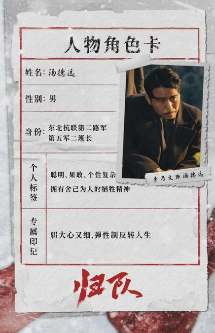 李乃文在《归队》中饰演汤德远。汤德远是一位沉稳老练、胆大心细的班长。