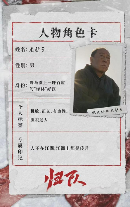 倪大红在《归队》中饰演老驴子。老驴子是野马滩上一呼百应的“绿林”好汉,他机敏、正义有血性,人虽不在江湖,但江湖上都是他的传说。