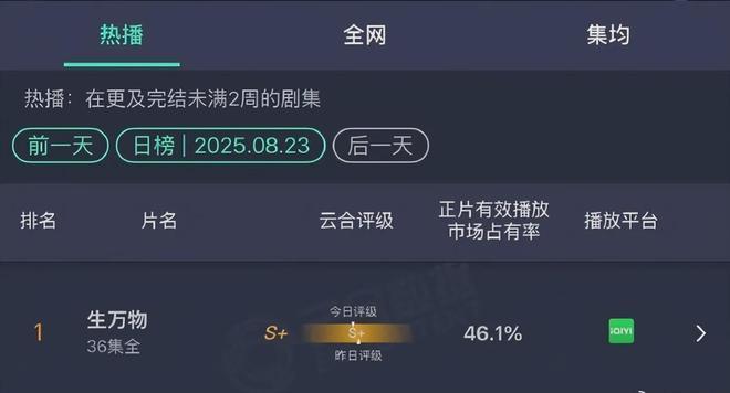 谁都没想到,在古偶一部接一部的暑期档,最后竟然是《生万物》这部年代剧杀出了重围。收视率接连破4,峰值达到4.35%,创下近3年央八最高记录。爱奇艺站内热度也是持续破万,一路看着它超越《苍兰诀》、《赘婿》等众多破万剧,热度峰值仅次于《狂飙》。真正台网双爆,收官时云合市占率竟然达到了惊人的46.1%。