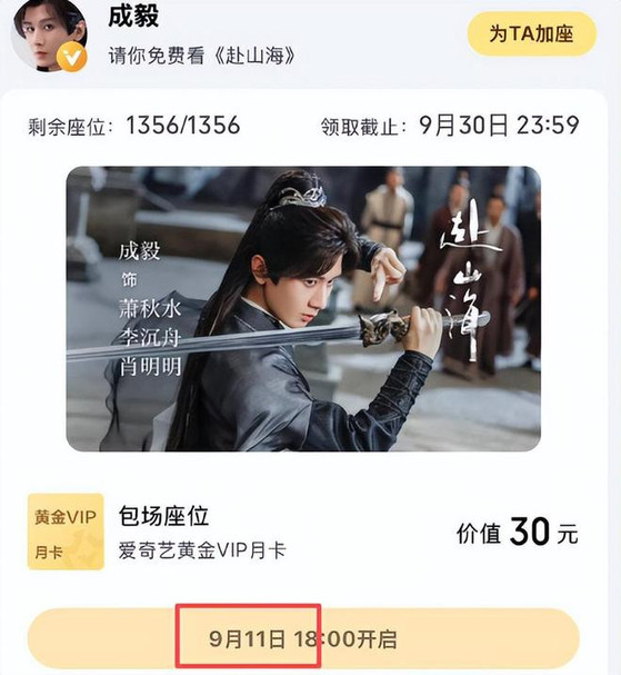 这个时候传来一个好消息,不少观众发现《赴山海》云包场开始测试了,上面显示的9月11日开播,终于有一部能看到下去的古装剧了。