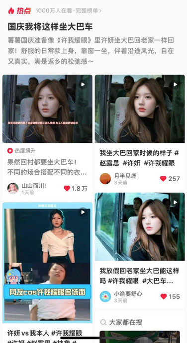 对女性需求的精准洞察,在《许我耀眼》中转化为与观众生活的紧密连结。剧中“许妍坐大巴”的片段,用小镇女孩挤大巴赴城的真实场景,戳中无数在外打拼女性的共同记忆;“模仿许妍式国庆旅游转场”也在社交平台引发大量讨论,成为观众表达对剧集喜爱的方式。
