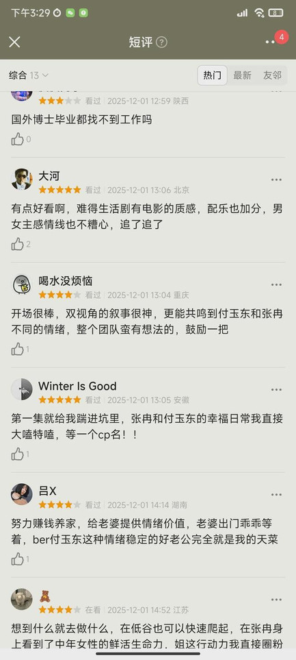 首播口碑也出来,好评如潮,基本全部观众都给出了好评。夸赞难得有生活剧拍出了电影质感,男女主感情线不糟心,男主努力赚钱养家,给老婆提供情绪价值,张冉和付玉东的幸福日常太好嗑,又甜又搞笑。双视角叙事很神,更能共鸣到付玉东和张冉的不同情绪。