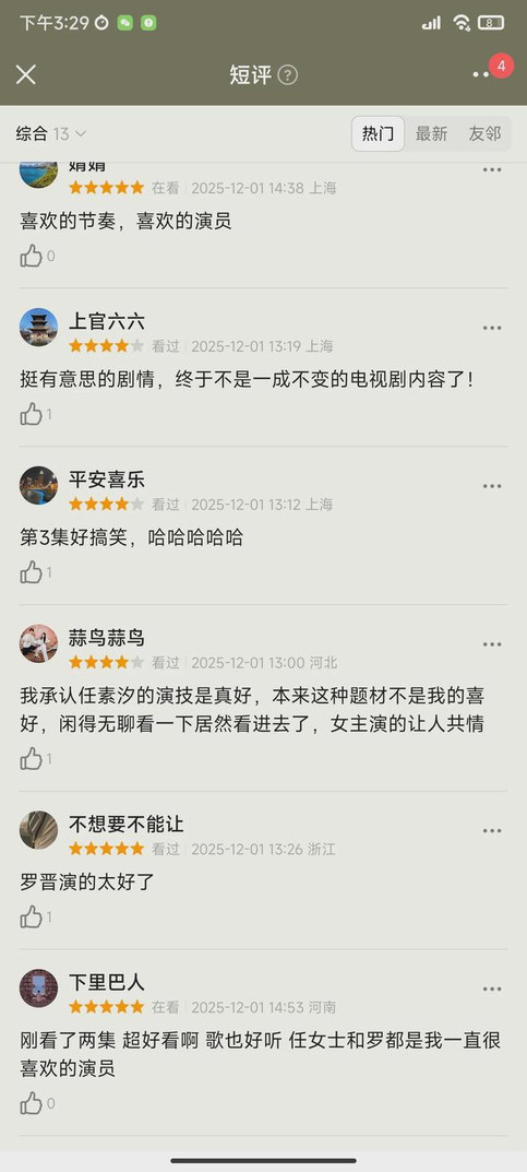 还有在张冉身上看到了中年女性的鲜活生命力,在低谷可以快速爬起,行动力让人圈粉。女主的演技很让人共情。发现任素汐主演的都市剧口碑都挺不错的,《我在他乡挺好的》评分8.1,《故乡别来无恙》评分8.3,《无尽的尽头》评分更是高达8.5,今年新剧最高分,相信这部剧的评分也不会低。