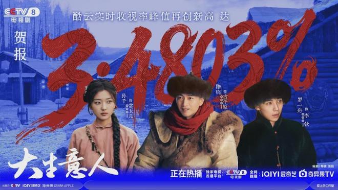 《大生意人》播出首日,央八开播27分钟收视率破3,是近三年央八首播日最快破3剧集,峰值达3.2151%。这个成绩,也是近三年央八剧集首播日实时收视率和首集平均收视率TOP1,2025年古装剧首播日全端播放量TOP1。在连破酷云4项纪录后,该剧更在开播第三天再创收视率新高,酷云实时收视率峰值达3.4818%。爱奇艺站内站内热度已突破8500。